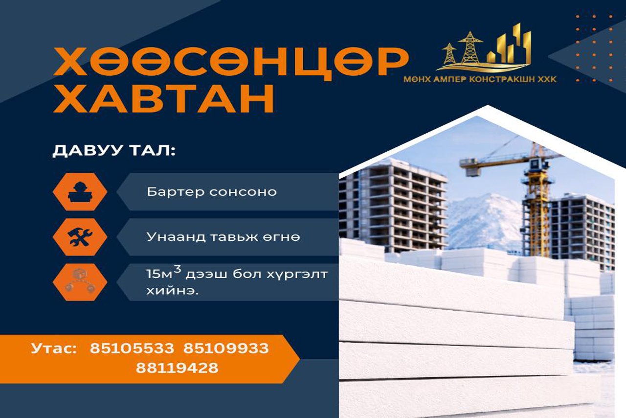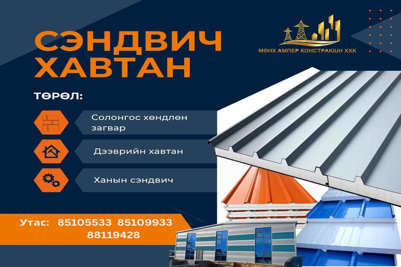 Монгол Улсын MNS болон олон улсын стандартын шаардлагад нийцсэн EPS хөөсөнцөртэй сэндвич хавтанг захиалгаар үйлдвэрлэн нийлүүлж байна.